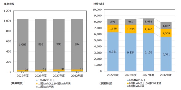 図8左は、事業者数を規模別(供給電力量)に分類したものであり、全ての年度において、事業規模が10億kWh未満の事業者が大多数を占めている。図8右は、各規模の発電事業者が見込む供給電力量を積算したものであり、積算した供給電力量の7割程度は、事業規模が100億kWh以上の事業者によって占められている。