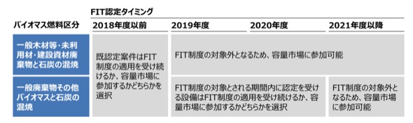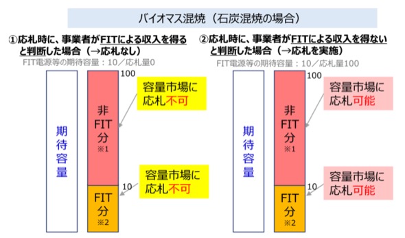 バイオマス混焼石炭火力は、FIT制度からの支払いを受けるか、もしくはFIT制度の適用を受けずに容量市場に応札するかを選択できるため、オークション需要曲線の公表時点ではこの供給力の扱いが確定しない。このため、容量市場に応札しない混焼電源の非FIT分(石炭分)は目標調達量に織り込まれていない。(※2019年度末までにFIT買取を開始している電源は、FIT分のみが「FIT電源等の期待容量」に計上されている)