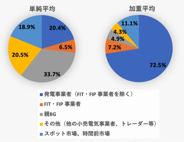 左円グラフでは、新電力の多くが親BGから電源調達している回答と整合的であるが、スポット市場依存度は2割程度に留まっていることが分かる。また旧一電小売部門の多くが、社内・グループ内発電事業者から電源調達しているため、加重平均した右円グラフでは、発電事業者からの調達率が高く表れている。