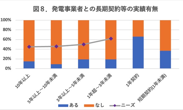 また、図8の折れ線(菱形マーカー)は、発電事業者と長期契約を結ぶニーズの有無について尋ねたものであり、どの契約期間の長さにおいても、ニーズは実績を大きく上回る結果となった。図3と図8から、発電事業者および小売電気事業者のいずれも、現状よりも長期契約を増やしたいと考えていることが明らかとなった。