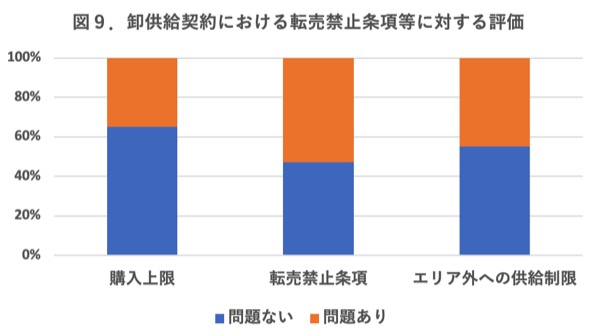 小売電気事業者に対するアンケートでは、卸供給契約における転売禁止や購入可能量上限、エリア外への供給制限の実績そのものではなく、これらに対する「評価」を尋ねている。