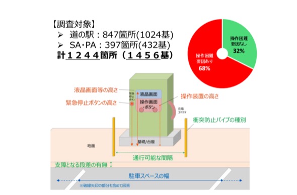 充電設備の利便性には、バリアフリーであることも重要である。国土交通省と経済産業省が、全国の道の駅、SA・PAに設置されている充電設備について、バリアフリー対応に関する調査を実施したところ、車椅子利用者が操作困難となる可能性がある充電設備の基数が68%に上ることなどが明らかとなった。