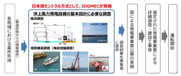洋上風力発電では、初期段階から国が関与し、より迅速・効率的に風況等の調査を行う仕組み(日本版セントラル方式)の確立に向けた検討を進めている。現在、JOGMECでは調査対象として北海道の3区域を選定し、洋上風力発電設備の基本設計に必要な風況や地質構造の調査を実施中である。