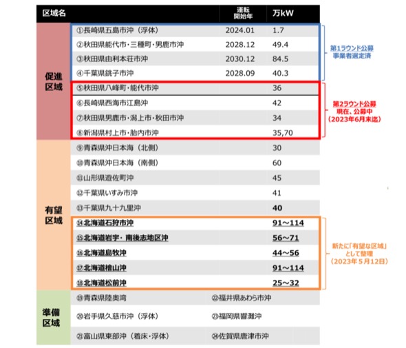 現在、「有望な区域」として合計10の区域(合計設備容量6GW)が整理されているが、仮にこれらの案件がすべて形成された場合、洋上風力産業ビジョンの官民目標である「2030年までに10GW」の案件形成が実現することとなる。