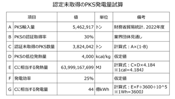 WG事務局では、一定の前提条件(認証取得率30%)のもとで、認証未取得のPKS数量に相当する発電電力量を、44億kWhと試算している。これは日本の年間総発電電力量の0.43%に相当する。