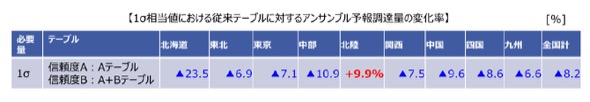 北陸エリアは地理的に狭く、予測における前線や雲の位置ずれなどによるエリア全体の日射量・発電出力への影響が他エリアより大きいため、信頼度Aの日において再エネ予測の「大外し」が多かったことが、必要量増加の原因と考えられる。このため、1σ調達への変更後、まずは北陸以外の8エリアでアンサンブル予報を適用することとする。