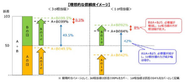 定性的(理想的)には、予測信頼度が低い方が誤差が大きくなると考えられ、図9のイメージでは、誤差の大きい日の上位50%が信頼度Bと設定されたと仮定する。また、A+Bテーブルとは、信頼度にかかわらず全日の誤差実績を母集団とする、全データ(A+B)の必要量テーブルである。