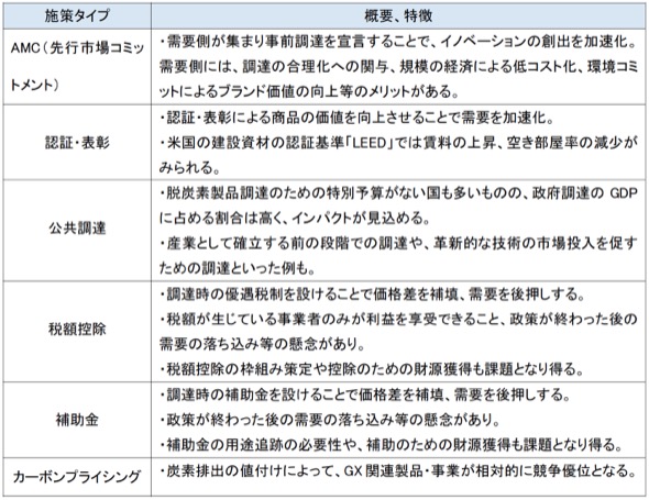 GX製品の需要創出策には、様々なタイプの手法があり、諸外国においても産業部門の特性に応じた複数の手法を適用することが一般的である。