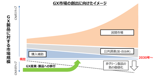 企業の脱炭素投資を促すためには、グリーントランスフォーメーション(GX)による価値が市場で適切に評価・選択される必要がある。政府ではこうした企業の脱炭素投資によって生まれる製品・サービスを「GX製品」と称し、その適切な価値の評価付けや市場創出に向けた検討を開始した。