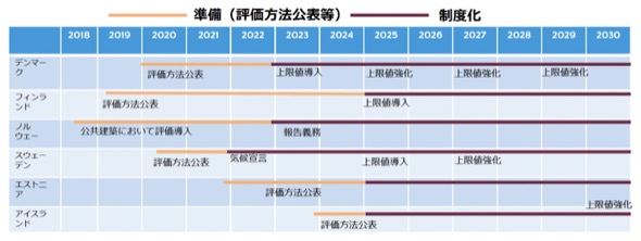 また、建築分野ではライフサイクルCO2排出量をホールライフカーボンと呼び、すでに複数の国や地域において、建築物のホールライフカーボンの算定報告の義務化や上限値規制が開始されている。