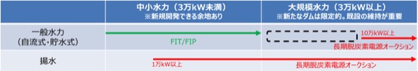 これらの一般水力を中長期にわたって維持、新設していくことは、電源の脱炭素化の観点から非常に重要であるため、今後、3万kW以上10万kW未満の一般水力については長期脱炭素電源オークションの対象(新設・リプレース)とすることとした。