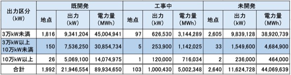出力規模別に見た、一般水力の導入量や発電電力量は表3のとおりであり、導入済み(既開発)3万kW以上10万kW未満の一般水力は、全体の3割強を占めている。