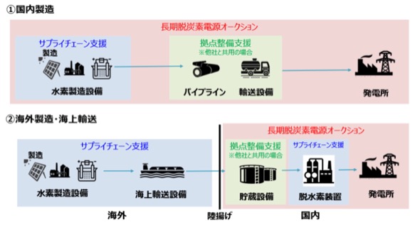 よって、水素・アンモニア(以下、水素等)については長期脱炭素電源オークションだけでなく、現在検討中の「価格差に着目した支援制度(サプライチェーン支援制度)」や「拠点整備支援制度」と連携しながら、発電事業者の投資判断を促進することとしている。