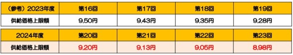 入札制度の対象となる事業用太陽光発電の買取価格は、入札により決定する。2024年度の入札対象は、FIP認定対象のうち250kW以上(ただし屋根設置の場合は入札免除)となる。2024年度の入札回数は前年度と同じ4回で、上限価格はそれぞれ9.20円、9.13円、9.05円、8.98円。2023年度から引き続き、入札ごとに0.07円から0.08円ずつ段階的に下がっていく。