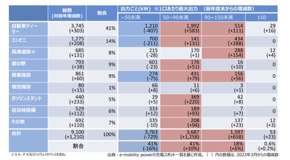 公共用急速充電器の9割をカバーするe-Mobility Powerによると、この1年間で50kW以上の急速充電器は2,000口近く増加し、50kW以上が累積設置数の約6割を占めており、全体として高出力化が進んでいる。
