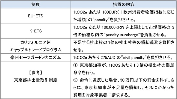 ETSの目標達成の規律として、諸外国等では、排出実績と同量の排出枠を償却すること(又はベースラインから超過した量と同量の排出枠を償却すること)という義務を課した上で、炭素比例のペナルティや償却義務の残存(無償割当てから控除)により、排出削減の実効性を担保している。