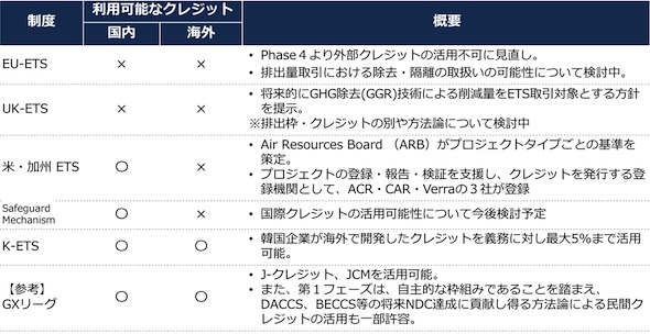 諸外国では、現在のEU-ETSや英国のUK-ETSは外部クレジットの活用を認めていない一方、米国カリフォルニア州や豪州、韓国においてはクレジットの活用を認めているなど、制度期間(フェーズ)によっても、クレジットの扱いは異なると考えられる。また、ETSで利用可能とするクレジットの種類(由来や活用技術等)や使用量(比率)についても検討が必要となる。