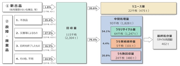 現時点、太陽光発電設備の廃棄はわずかであるため、廃棄等太陽電池モジュールの排出量(回収量)も少量であり、環境省が実施したアンケート調査によれば(2022年度)、現時点の排出要因は、不良品や災害等によるものが、それぞれ約3割を占めている。また、回収量全体のうち、約2割がリユースされ、約5割がリサイクルされている。