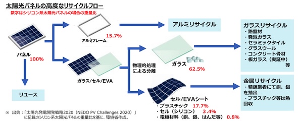 また現時点、プラスチックやシリコンは熱回収されているため、プラスチック等のマテリアルリサイクルの促進が課題とされている。重量の約6割を占めるガラスについては、より付加価値の高いフロート板ガラスへのリサイクル技術の開発が進められている。