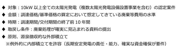 FIT/FIP制度を利用する太陽光発電設備については、再エネ特措法の改正(2020年6月)により、10kW以上の事業用太陽光発電設備を対象として、廃棄等費用を原則、源泉徴収的に外部積立てを行う制度が開始された。積立時期は、調達期間/交付期間の終了前10年間(20年間の調達期間/交付期間のうち、後半の10年間)であり、FIT制度開始から10年が経過した2022年7月から、FIT制度初期の事業の積立てがすでに始まっている。