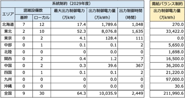 系統制約(混雑)による自然変動電源の出力制御の中長期見通し(2029年度想定)の算出結果は、表2の通りである。