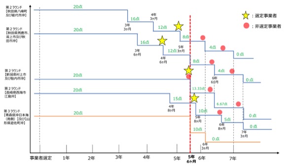 これにより、事業者選定日から運転開始日までの平均期間は、第1ラウンド選定事業者(長崎県五島市沖を除く)では7年7ヶ月であったのに対して、迅速性を採用した第2ラウンドでは、選定事業者では5年3ヶ月、公募参加者全体では6年1ヶ月と、大幅に期間が短縮される結果となった。