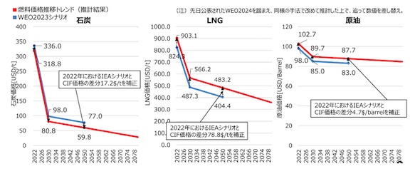コスト検証WGでは、従来と同様に、国際エネルギー機関(IEA)の「World Energy Outlook」(WEO)に記載されている日本等の価格トレンドの見通しを利用して、将来の燃料価格を推計することとした。なお、図1の数値はWEO 2023年版を参照したものであるため、今後数値を2024年版に差し替える予定としている。