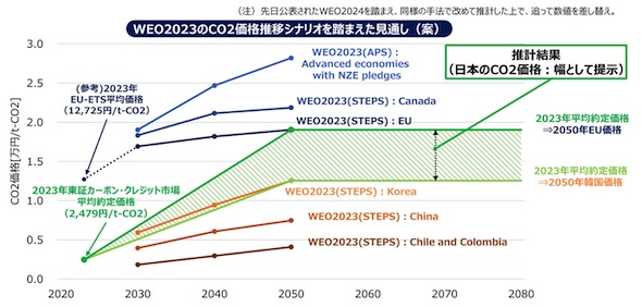 また、エネルギー情勢が日本に類似すると考えられる韓国では、すでに2015年から排出量取引制度(K-ETS)が運用されており、WEOでもその将来価格が推計されている。よって、今回のコスト検証WGでは、2050年のCO2価格として、EU-ETSとK-ETS両者の幅を持って示すこととして、2051年以降については、2050年の価格を横置きする。