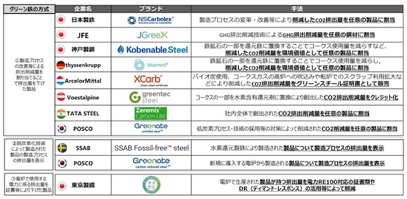 各社が自社製品をグリーンとする手法には、「①製造プロセスの改善等による排出削減量を製品に割り当てる方式」「②水素還元製鉄等の製造プロセスの排出量を表示する方式」「③電炉で使用する電力に係る排出量を電力証書等により下げる方式」の3つがある。