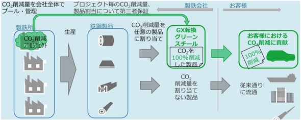 ①の方式の一つとして、日本鉄鋼連盟では、追加コスト負担等の「追加性」があるCO2削減量を製鉄会社内でプール・管理した上で、製鉄会社の販売方法に合わせてCO2削減量を任意に割り当てる(削減実績量の)「マスバランス方式」を提案している。ただし、これはCO2削減量のアロケーションであり、一般的なマスバランス方式とは言葉の使い方が異なることに留意が必要である。