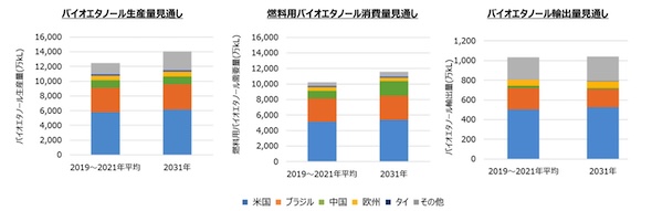 現時点、日本国内でのバイオエタノールの生産量及び自給率はほぼゼロであるため、今後の需要拡大に向けては、ブラジルや米国、アジアなどのバイオエタノール生産国と安定的なサプライチェーンを構築する必要がある。当面はバイオエタノールの大半を輸入に頼らざるを得ないが、原油輸出国との重複は少ないため、エネルギーセキュリティの向上に資するものと考えられる。