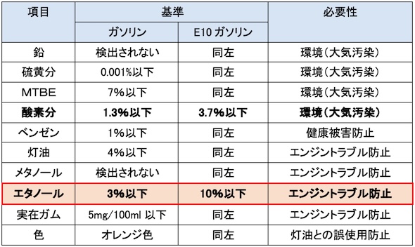 日本国内でも、E10(エタノール10%混合ガソリン)までの燃料品質については、すでに「揮発油等の品質の確保等に関する法律」(品確法)や道路運送車両法等において、燃料規格が定められている。