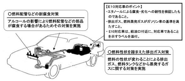 なお車両側では、日本独自の「軽自動車」を除き、普通車新車の多くはすでにE10(ETBEで約22%)混合ガソリンに対応している。