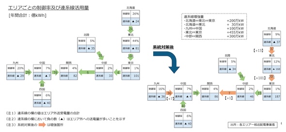 「系統対策」では、現在建設中の地域間連系線の増強に加え、マスタープランの増強計画がすべて実現した場合の効果を試算している(北海道→東北+200万kW・東北→東京+200万kW、北海道→東北+30万kW、九州→中国+100万kW、東北→東京+455万kW、中部⇔関西+300万kW)。