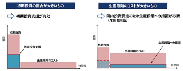 米国のIRA法や欧州のグリーン・ディール産業計画など、戦略分野の国内投資を強力に推進する産業政策競争が世界的に活発化していることを踏まえ、総事業費が大きく、特に生産段階でのコストが高いもの(電気自動車、グリーン鉄、グリーン化学、SAF、半導体の一部など)について、生産・販売量に応じた税額控除措置を講ずる「戦略分野国内生産促進税制」を導入していく。