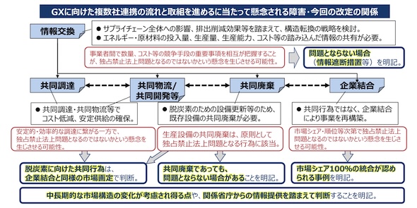 公正取引委員会は、2024年4月にガイドライン「グリーン社会の実現に向けた事業者等の活動に関する独占禁止法上の考え方」の改定版を公表し、予見可能性の向上のため、他事業者との情報交換が問題とならないケース、共同廃棄が認められるケース等について明確化を行った。今後も市場の実態等を踏まえ、継続的にガイドラインを見直す予定としている。