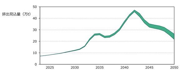 太陽光発電(住宅/非住宅)の導入量は、FIT開始前は約560万kW、FIT開始後では6,823万kWに上る(2024年3月末時点)。使用済み太陽光パネルの排出量は2040年代前半にピークを迎え、50万t/年に上ると推計されている。