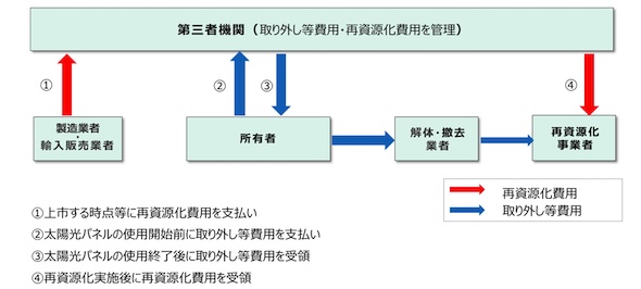 太陽光発電設備の解体・撤去等と、太陽光パネルの「リサイクル(再資源化)」は連続的かつ一体的に行われるものであるが、その費用の負担者や費用の流れは大きく異なる。