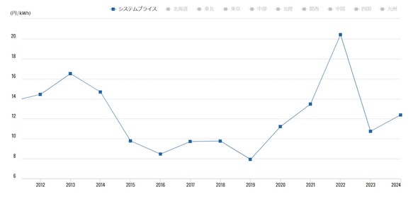 2023年度の回避可能費用等が急上昇した理由は、その前年の2022年度にウクライナ危機等による化石燃料価格の高騰により、卸電力市場価格が高騰したこと(図3)を反映したものである。