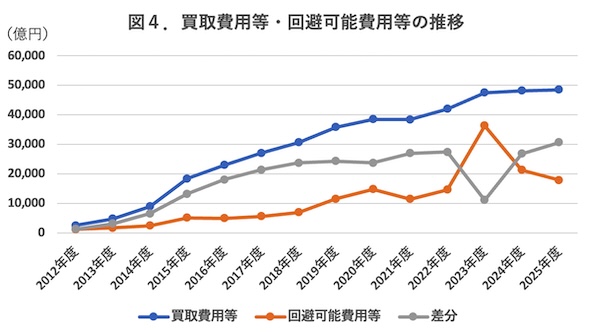 また、卸電力市場価格の沈静化を反映し、回避可能費用等を控除後の実質的な国民負担は、2025年度には初の3兆円超えが見込まれている。