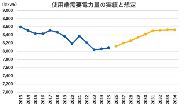 再エネ賦課金は、小売電気事業者が販売する電力量のみに課されるものである。そこで、まずは過去実績や電力広域的運営推進機関による需要想定(使用端需要電力量)を元に、「販売電力量」を推計する。