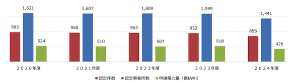 また、賦課金単価の算定にあたっては、再エネ賦課金の減免制度が適用される適格事業者の減免申請電力量を控除する必要がある。2024年度の再エネ賦課金減免制度の認定件数は、855件・1,441事業所であり、認定申請に係る電力量は426億kWhとなっている。この減免制度は運用の厳格化により、今後は減免申請量が減少すると予想される。