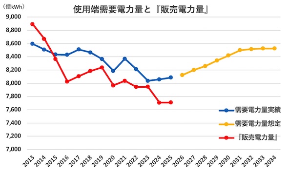 先述の図5に、賦課金単価算定用の『販売電力量』の推移を重ねたものが図6である。この13年間で『販売電力量』のほうが需要電力量よりも減少幅が大きいことが分かる。『販売電力量』の減少は、賦課金単価を押し上げる方向に作用する。
