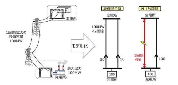 電力系統は、発電機や送電線、変圧器など様々な多数の設備から構成されている。これら複数(N)ある設備のうちの1つが故障(-1)することを「N-1故障」、同時に2つが故障(-2)することを「N-2故障」と呼び、N-1故障が起きても電力供給に支障を起こさないという考え方である「N-1基準」は、電力を安定供給する上で国際的に広く用いられている。