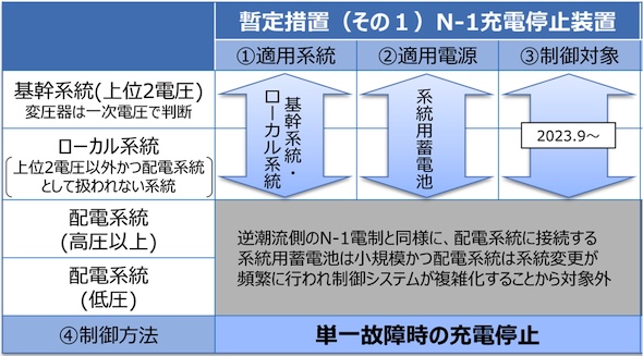 「N-1充電停止」の適用系統は、逆潮流側のN-1電制と同様に、基幹系統およびローカル系統を対象として、この適用電源および制御対象は、新規に接続を希望する特別高圧の系統用蓄電池である。