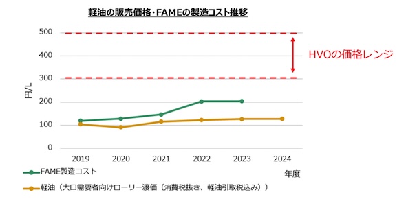 現在のFAMEの製造コストは200円/L程度であり、流通費も含めると、軽油(大口需要者向けローリー渡価格(消費税抜き、軽油引取税込み))の2倍程度の価格となっている。また現時点、HVO(第二世代BDF)の価格は統計情報が公表されていないが、軽油の3〜5倍程度であると考えられている。