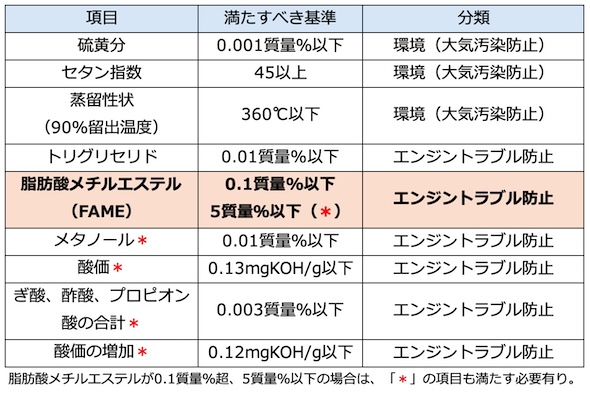 他方、EUでは公道走行用の軽油規格として、FAME混合率上限を7%(B7)と定めているほか、「B10」対応車について欧州自動車工業会が適合車リストを公表するなど、より高い混合率のFAMEを使用できる環境を整備している。