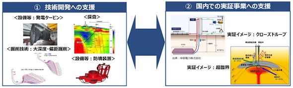 次世代型地熱の社会実装に向けては、世界的な市場獲得に向けた要素技術・研究開発と、実証試験による世界に先駆けた次世代型地熱システムの構築を併行して進める必要がある。よって国は、次世代型地熱の各技術における探査・掘削技術、設備設計、部材の開発等の支援と、国内での実証事業への支援を両輪で進めることとした。