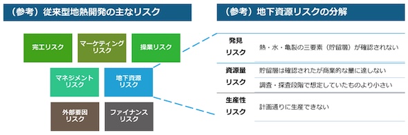 また、どのような電源種であっても新規開発には一定のリスクが伴うが、地熱発電に特有のリスクとして「地下資源リスク」がある。例えば天然の熱水が不要な次世代型地熱技術であれば、従来型地熱と比べてリスクを低減できる可能性もあるが、別タイプのリスクが高まる可能性もある。