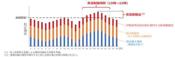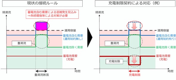 早期連系追加対策は、充電制限に同意すること(充電制限契約)を前提に、系統増強なしでの系統接続を認めるというものだ。具体的には、系統用蓄電池の充電により蓄電池を含む需要が系統の運用容量を超過することが想定される場合に、特定の断面(時間帯)における充電を制限することで、系統の過負荷を回避しつつ蓄電池を接続できるようにする。